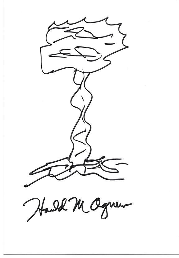 AGNEW, Harold (1921-2013). American physicist best known for having flown as a scientific observer on the Hiroshima bombing mission. He took along a movie camera and took movies of the event over Hiroshima. On Titian he carried the plutonium core of the Nagasaki Fat Man Bomb. He became the 3rd Director of the Los Alamos National Laboratory. Using a black ink Sharpie pen, Agnew has drawn the bomb blast over Hiroshima as he remembers it. Signed in full. Overall size, 8”x10”. Excellent condition...........................................$67.50