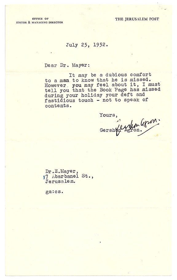 AGRON, Gershon (1893-1959). Israeli public figure. Born in Russia, went to the U.S. (1916), to Palestine with the Jewish legion (1917), Director of Press Office of the World Zionist Organization (1920-21) and (1924-27). Founded and edited Palestine Post (1932) and from 1950 the Jerusalem Post. Head of Israel Government Information Services (1949-50) and Mayor of Jerusalem (1955). Typed letter signed, one page on the imprinted stationery of The Jerusalem Post, July 25, 1952. In English he writes to a Dr. E. Mayer. Interesting content. Fine condition..................SOLD