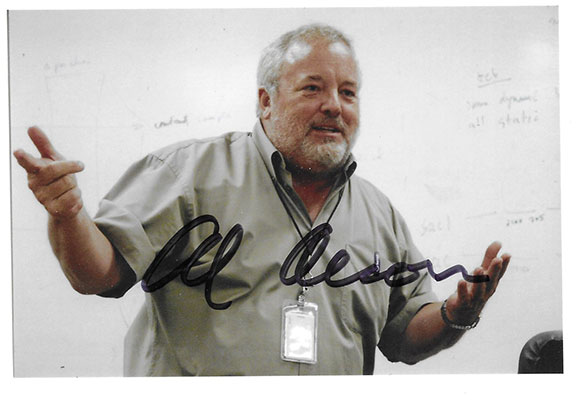 ALCORN, Al Allan  (1948-   )  Pioneer computer scientist. Creator of the first video game “Atari” and “Pong” during the 1970’s.   At Atari, Alcorn hired an 18-year-old Steve Jobs who had significant body odor.   Color photograph of Alcorn, half-length pose 3.5”x5” boldly signed. Very fine condition............................. $55.00