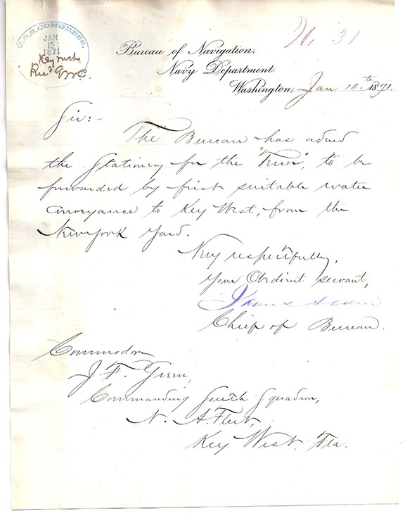 ALDEN, Admiral James (1810-1877). American Rear Admiral during the Civil War. He commanded the Brooklyn during the famous Battle of Manila bay. When the Monitor Tecumseh was sunk, Admiral Alden stopped his ship, throwing the fleet into disorder. He then received the famous order from Admiral Farragut: “Damn the torpedoes! Go Ahead, here!” Typed letter signed, Jan. 10, 1871 on the imprinted stationery of Bureau of Navigation, Washington. To Commander J.F. Green (1811-1897) while he was commanding the Southern Squadron of the North Atlantic Fleet at Key West, Florida. Naval Orders for forwarding stationery for a vessel named Terror by the first suitable water conveyance to Key West from the New York yard. Circular stamp at the top left corner of the U.S.S. Congress, Jan. 19, 1871”. Nice Naval item....................SOLD