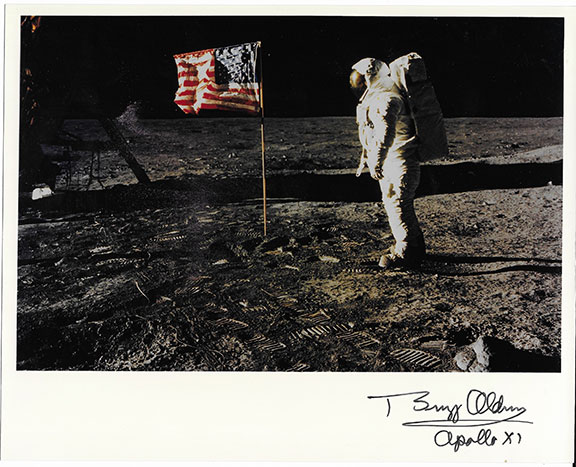 ALDRIN, Buzz (1930- ) American astronaut. Member of the historic Apollo II Mission and the second man to walk on the Moon. Color portrait, appx. 8”x10” of Neil Armstrong’s photograph of Buzz Aldrin walking on the lunar surface at Tranquility Base on July 20, 1969 facing the planted American flag. Signed on the lower white margin “”Buzz Aldrin Apollo XI.” Mint condition.......................$525.00![]() |
