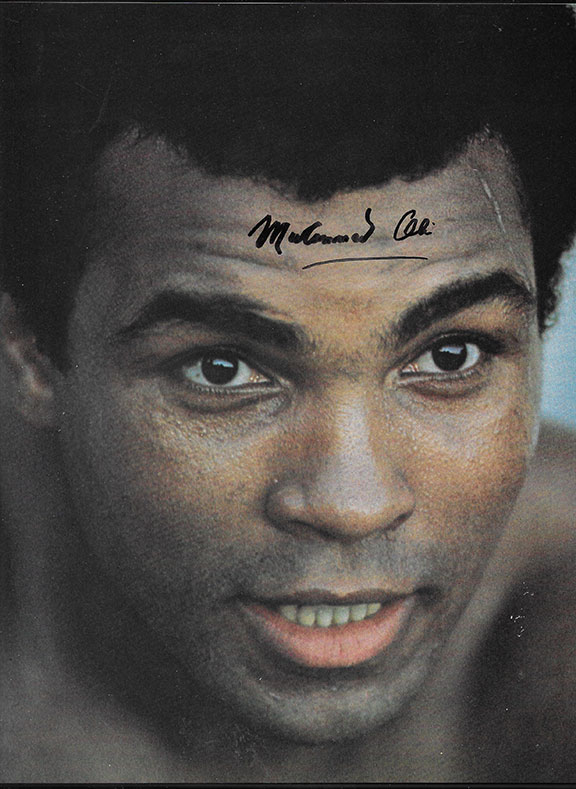 ALI, Muhammad (1942-2016). American professional boxer, considered by many the greatest heavyweight boxer of all time. Olympic Gold medalist (1960). His greatest win might have been traveling to Iraq after it invaded Kuwait. Saddam Hussein took thousands of foreign hostages including 15 Americans. He used them as human shields. Some of them had worked for the GM plant in Baghdad. Ali was supposed to meet Saddam, but Saddam stalled for a week. Ali was in rough shape as he ran out of his Parkinson’s medication. Ali was able to find some of the medication at a Baghdad hospital and met with Saddam Hussein on Nov. 29, 1990. Ali convinced Hussein to release all the American hostages, they went to Ali’s modest hotel room. On Dec. 2, 1990, Ali and the hostages flew out of Baghdad to JFK airport in New York. Just a few weeks later on Jan. 16, 1991, the U.S. began bombing Iraq known as “Operation Desert Storm.” Muhammad Ali by Wilfrid Sheed A Portrait in Words and Photographs. Thomas Y. Crowell Co. 1975, First Printing. Two hundred fifty-six pages, heavily illustrated in color. Folio size. Hand signed “in person” by Ali on a wonderful close-up full face color portrait on the opening of the book. A few books were stacked up and hastily signed by Ali on the same day. In V/G condition and a very scarce book to be found signed by Ali.......$475.00