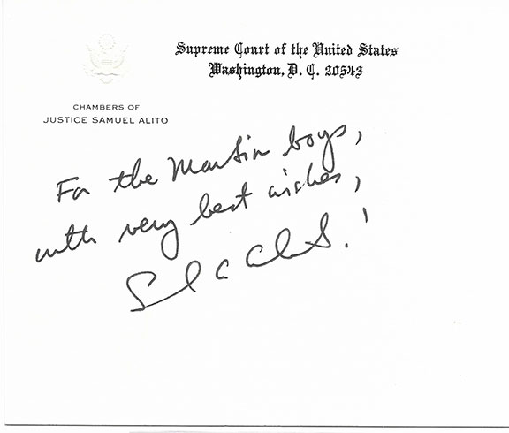 ALITO, JR., Samuel (1950- ) American jurist, nominated to the High Court by George W. Bush in October 2005. Uncommon Supreme Court of the United States, Chambers of Justice Samuel Alito. Inscribed: “For the Martin boys, with every best wishes, Samuel Alito Jr.” In mint condition.....................$165.00![]() |
