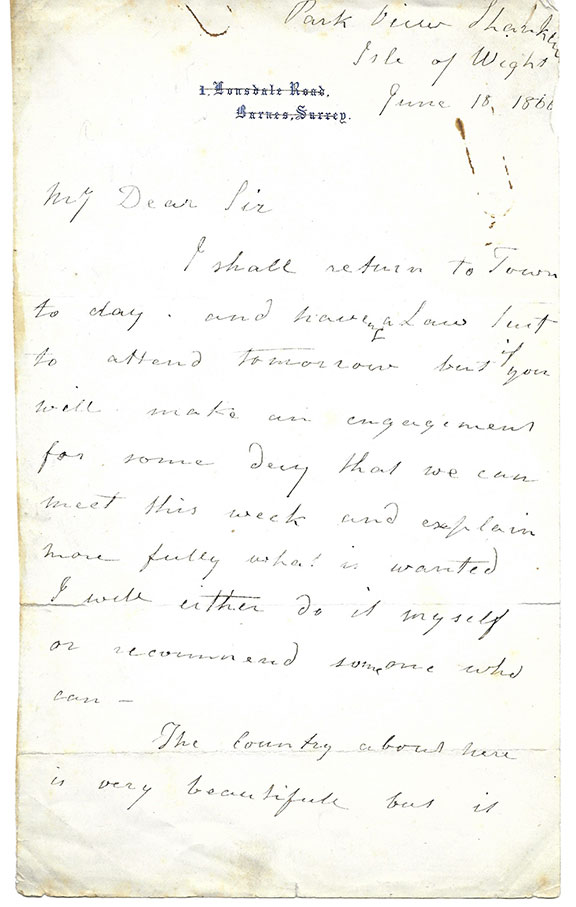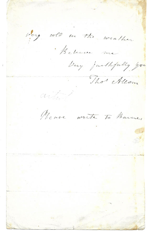ALLOM, Thomas (1804-1872). Architect, artist, and illustrator. Founding member of what became the Royal Institute of British Architects. He designed numerous buildings in London, he was one of two architects to design the Houses of Parliament. His topographical works include Constantinople and the Seven Churches of Asia Minor, published in 1838 and China Illustrated, published in 1845 Very uncommon autograph letter signed one and a half pages, Park View Shanklin, Isle of Wright, 18 June 1861. He writes: “....returning to London from the Isle of Wright today, hoping to make arrangement to meet and explain more fully what is wanted. I will either do it myself or recommend someone who can. The country about here is very beautiful but it’s very cold...” Signed “Thos Allom.” A few minor blemishes and light discoloration...................................$325.00