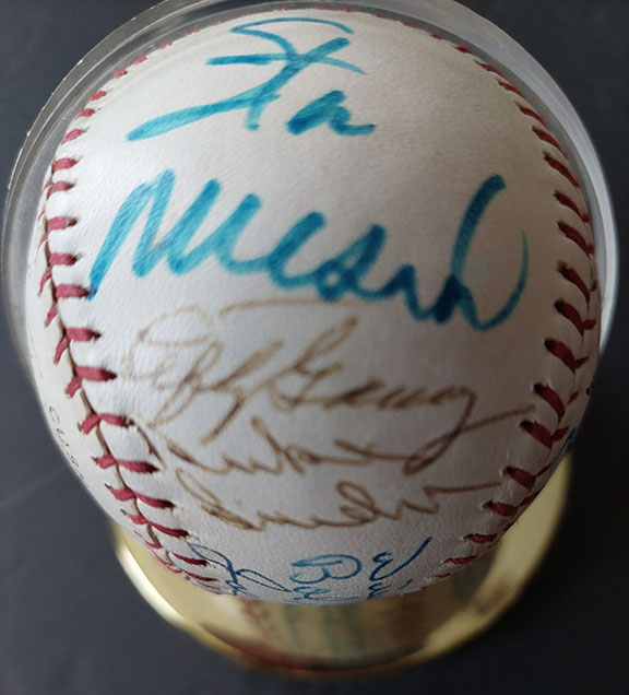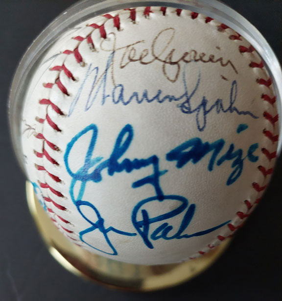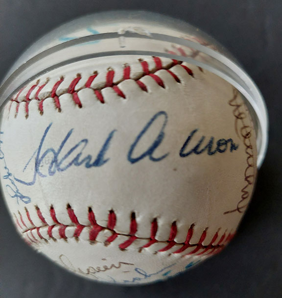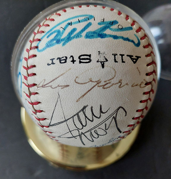 ALL STAR BASEBALL. Those signing are Hank Aaron on the sweet spot, Stan Musial, Lefty Gomez, Duke Snider, Willie Stargell, Bob Gibson, Joe Sewell, Johnny Mize, Warren Spahn, Joe Cronin, Jim Palmer, Luke Appling, Yogi Berra, Ralph Kiner, Luis Aparicio, Willie Mays, Ron Guidry and Juan Marichal. Signatures V/G to Fine. Complete with ball holder.......................................$375.00