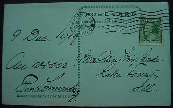 AMUNDSEN, Roald (1872-1928). Norwegian Polar Explorer; discovered the South Pole in 1911. Flew over the North Pole. Disappeared on a flight to rescue Nobile who was returning from the North Pole. Recent discoveries state that it appears that Amundsen not only was the first to reach the South Pole but also the first to reach the North Pole with Nobile and Ellsworth. Amundsen project was known as the “Fran Expedition” (1909-1912) whose aim was to reach the South Pole. Postcard, postmarked New York, December 1909, filled out in Amundsen’s hand to a Mrs. Alice Gade in Illinois. The explorer writes: “9 Dec. 1909, Au revoir Roald Amundsen”. Very unusual. Mounted to black paper otherwise a fine example................ SOLD