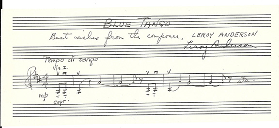 ANDERSON, Leroy (1908-1975). Considered to be one of America’s four greatest 20th century composers of instrumental music. He wrote theme songs for television’s “The Late Show” and for “I’ve Got A Secret”. His best known work can be considered to be “blue Tango”. It made #1 on “The Hit Parade” (1952) and received a gold record for one million in sales. Anderson was inducted into the Songwriters Hall of Fame in 1988. AMuQs, Anderson has penned one line of music from “Blue Tango” on printed music paper measuring appx 3.5”x9”. The composer has identified the work “Blue Tango” and has written a wonderful sentiment: “Best wishes from the composer” and has signed his name twice, once being in block letters. Absolutely perfect and a scarce example from Anderson’s pen.......SOLD