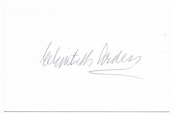 ARDEN, Elizabeth (1878-1966). Canadian born, she is called “The Mother of Beauty Cream.” She created and popularized the American Beauty industry. She opened her first beauty salon in 1910 on New York’s Fifth Avenue. She is a pioneer in advertising cosmetics. After her death, her business sold for 40 million dollars. 3.25”x5.50” card signed on both sides. Not a common signature...$75.00 |