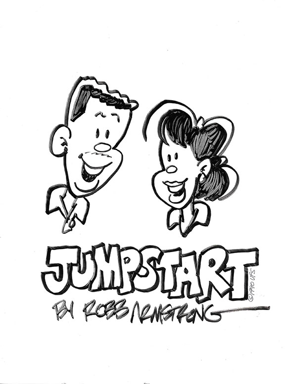 ARMSTRONG, Robb (1962- ) African American cartoonist, painter and musician. His comic strip Jumpstart is the most widely syndicated daily strip by an African American in the world. At the age of three he admired and befriended Charles Schulz. He popularized the term “Couch Potato.” He eventually teamed up with Schulz to help young black creators access to the comic industry. Jumpstart strips appear in 300 papers. The main characters are Joe and Marcy. On a large card measuring 8.5”x10.5” the artist has drawn his main characters adding “JUMPSTART by Robb Armstrong.” One little crease at top right corner otherwise in fine condition. Not common as such...........$55.00