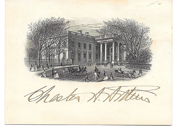 ARTHUR, Chester A. (1830-1886). Twenty-first President of the United States. Excellent full signature on an engraved card depicting the Executive Mansion. No flaws..........SOLD