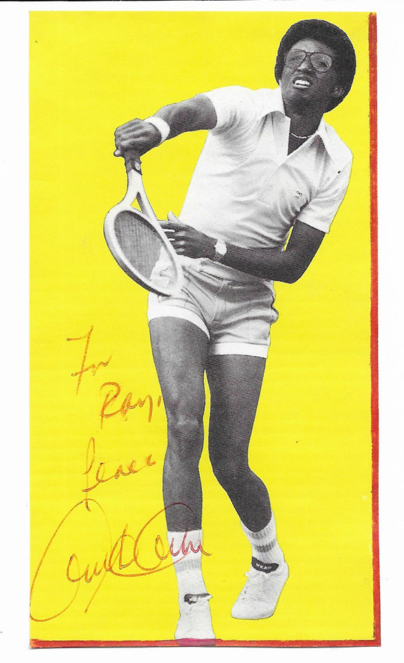 ASHE, Arthur (1943-1993). African American tennis legend. Full length portrait of Ashe swinging his tennis racquet. Measures 4.75”x2.5” and on the verso is a full page ad for Advantage Ashe Tennis Glasses. Inscribed: “For Ray, Peace Arthur Ashe.” In fine condition....................$175.00![]() |