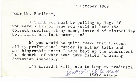 ASIMOV, Issac (1920-1992). Russian American sci-fiction writer, considered one of the big 3 science fiction writers. Typed letter signed on the verso of a postcard dated 3 October 1969 to Dear Mr. Berliner: “I think you must be pulling my leg. If you were a fan of mine you would a) known the correct spelling of my name, instead of misspelling both first and last names, and--- b) you would be quite aware that through all my professional career in all my talks and autobiographic notes I have kept up the consistent “trademark” of what some have called “charming Asimovian immodesty.” I’m afraid I will have to keep my trademark.’ Signed with a full ink signature. In very good condition, most unusual content.........$195.00