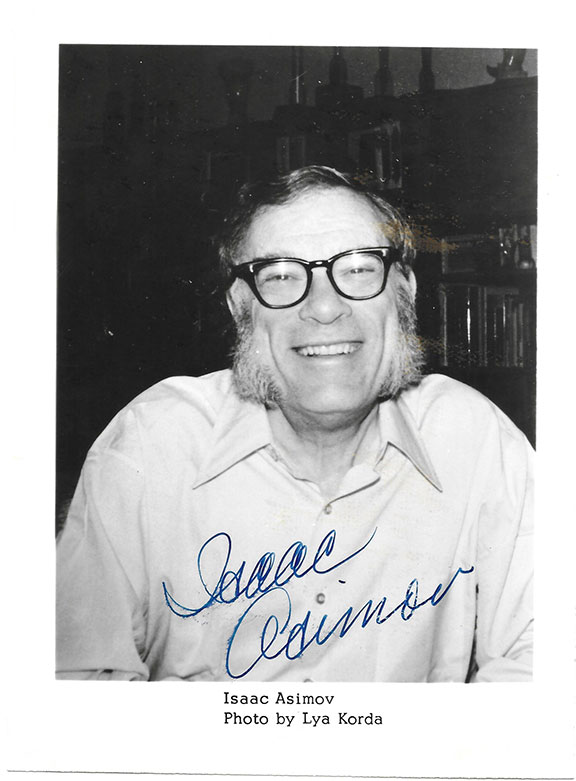 ASIMOV, Isaac (1920-1992) Russian-American biochemist. Popular science fiction writer. Wrote 380 short stories. Named in his honor a creator on Mars and Asteroid 5020 Asimov. Photograph 5”x7”, B7W, head and shoulders pose smiling. Signd with a fabulous full signature. In V/F condition.......................SOLD |
