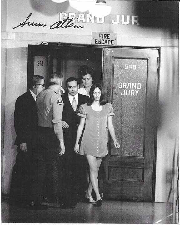 ATKINS, Susan (1948-2009) Convicted American murderer who was a member of the “Manson Family.” She was convicted of participating in eight of the killings including “Tate/LaBianca.” She was sentenced to death but the sentence in California was commuted to life in prison. At the time of her passing she was California’s longest serving female inmate. Fabulous B&W photograph, 8”x10” of Susan Atkins leaving the Grand Jury room. Very boldly signed with excellent contrast. In excellent condition. Very scarce in signed photographs..........SOLD