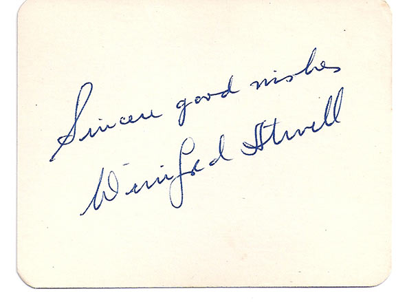 ATWELL, Winifred (1914-1983). Trinidadian pianist who was very popular in Britain and Australia. During the 1950’s she had many boogie-woogie and ragtime hits. She sold over 20 million records and was the first black person to have a #1 hit in the UK singles chart. She is still the only female instrumentalist to do so. On a large card, she has written a three word sentiment, signed in full. Her signature is borderline rare. In very fine condition................................$85.00