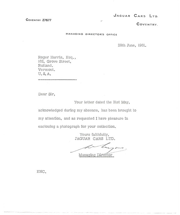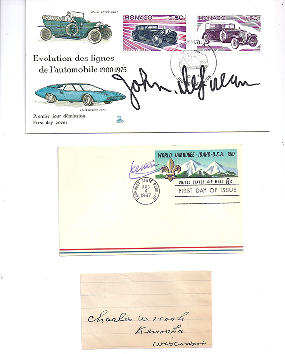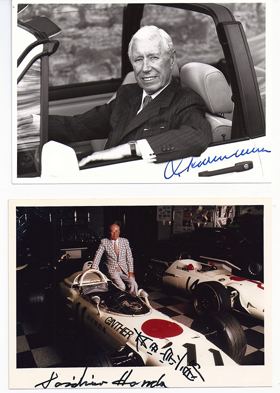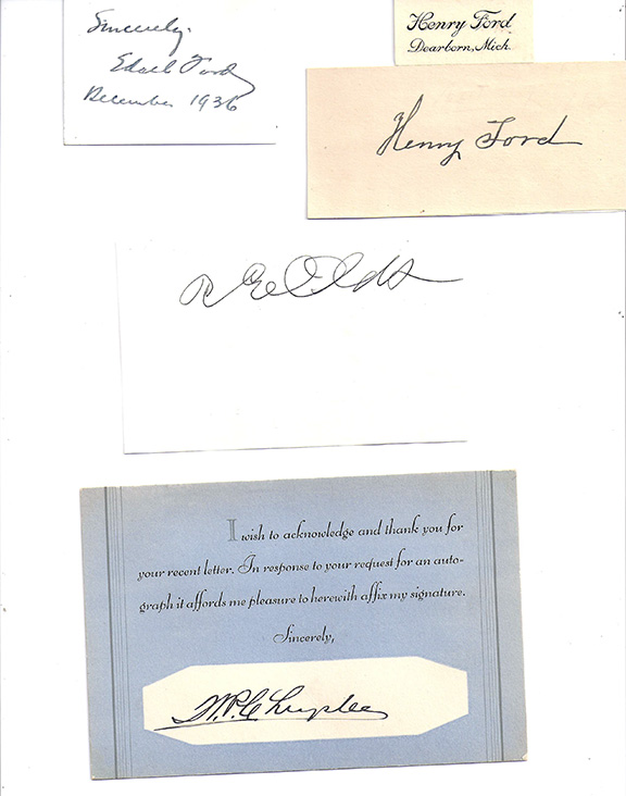 Included are examples of: Henry Ford - signature Charles Duryea - signature Edsel Ford - one word sentiment, signed and dated December 1936 Ranson E. Olds - signature Walter P. Chrysler - signature. His response to an autograph request, on official card Charles W. Nash - Full signature, Kenosha, Wisconsin Eddie Rickenbacker - full signature John DeLorean - signature on automobile First Day Cover Enzo Ferrari - signature on a First Day Cover Wilhelm Karmann - signed photograph Dr. Ferry Porsche - signed photograph Soichiro Honda - signed photograph in Japanese and English Jesse Dixon - Autograph letter signed: “Jesse D.” Henry Leland - Typed letter signed, March 6, 1930. Guy Vaughn - two word sentiment, signed & dated on a First Day Cover C. F. Kettering - signature along with 8x10 photo Joseph Galamb - Document signed, 1921 Henry Ford II - signed 8”x10” photo Lee Iacocca - signed 8”x10” photograph Carroll Shelby - inscribed and signed 3”x5” card Lodge, Oliver - English physicist who published his belief in the possibility of communication between the living and the dead. Excellent content T.L.S. (1927) to an individual that he was involved in a bad car crash because of high speeds. Edward F. Fisher (Fisher Body Corp) Typed letter signed, April 27, 1932 WILLYS, John North Rare photograph signed, 1931 PELLETIER, Jeune French automobile manufacturer scarce T.L.S., 1904 KING, Charles B. (1868-1957). Automotive pioneer, inventor, mystic and industrialist. King was the first person in Detroit to design, build and drive a self-propelled automobile three months before Henry Ford built his automobile. The Detroit Journal of March 7, 1896 reported that King drove his motor-propelled vehicle down Woodward Avenue. He was the first person in Detroit to build and drive such a vehicle. The Journal also reported that King made and sold the first complete automobile in Detroit. A fine signature of King on a card. Extremely scarce signature as this is the second King autograph that we have handled in over 50 years LYONS, Sir William (1901-1985) Known as 'Mr. Jaguar." Founder of Swallow Sidecar Co and Jaguar Cars Ltd. (1922). Chief Executive Officer for 50 years until retirement in 1972. Very scarce T.L.S. on Jaguar Cars Ltd. letterhead, 1961, responding to an autograph request. Quite scarce More details on request. The collection.................................$6,900.00 ![]() ![]() ![]() ![]() |