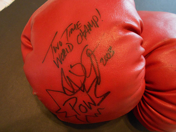 AYALA, Paulie   (1970-   )  American professional boxer who held two bantamweight titles. Voted 1999 boxer of the year.  Matching pair of MacGregor boxing gloves. On the left hand glove, Ayala has written and signed: “Two Time World Champ! Paulie Ayala, 2003.”  In addition he has written “POW.” In very good condition