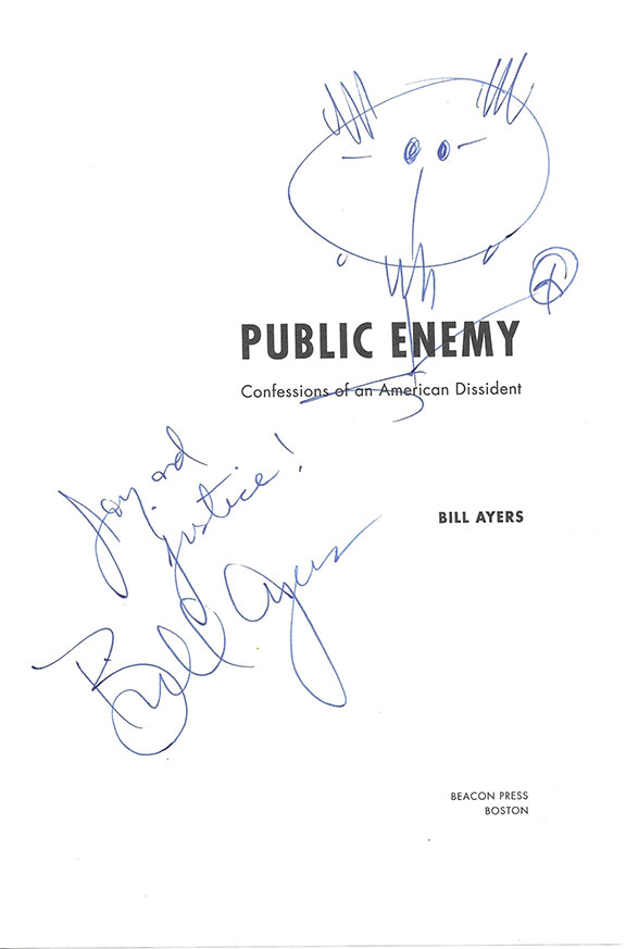 AYERS, Bill (1944- ) Co-founder and leader of the far-left terrorist group The Weather Underground. A self-described communist revolutionary group that bombed public buildings. Participated in the bombing of the NYC Police department Headquarters, The U.S. Capitol Building and the Pentagon. One of his noted quotes: “Every president in this country should be tried for war crimes, including Obama.” Title page to his book “Public Enemy” where he has written: “Joy and justice Bill Ayers.” In addition, he has drawn a self-portrait of himself. Genuine signatures of Ayers are not common, most signatures offered on 3”x5” cards are forged...........$55.00