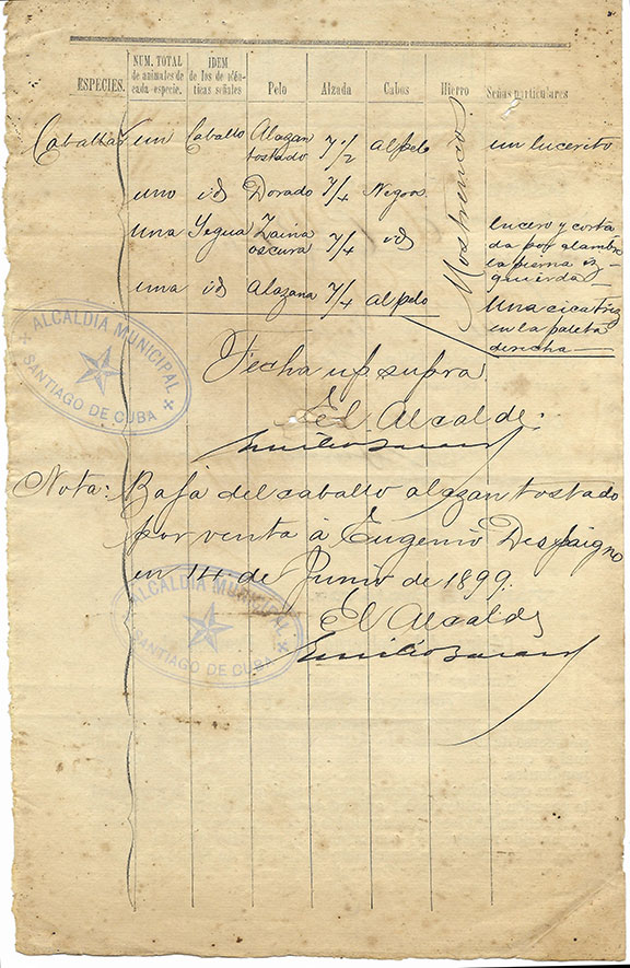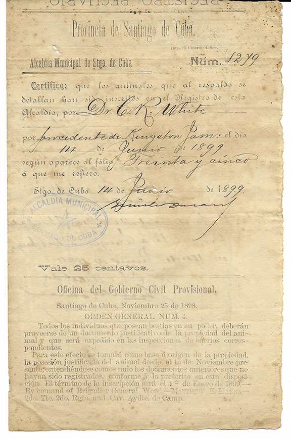 BARCARDI, Emilio (1844-1922). Cuban industrialist, politician and President of Barcardi Rum. Barcardi Rum was founded in 1862 and the rum business grew under his leadership which was made official in 1877 when he was named president of the company. He held that position throughout the 70’s, 80’s and 90’s. He became politically active supporting the rebels and was arrested and imprisoned. During the American occupation and governance of Cuba he worked with the American military. He was appointed by Leonard Wood Mayor of Santiago. Barcardi is the largest privately held family owned spirit company. Partly printed document signed three times. Municipal de Santiago de Cuba, 14 June 1899, appx. 6”x10”, signed in the center of the document next to a handstamp of the Mayor of Santiago. On the verso Barcardi has signed his name twice, both signatures near the Municipal, Santiago de Cuba handstamp. In very good conditione.................................$225