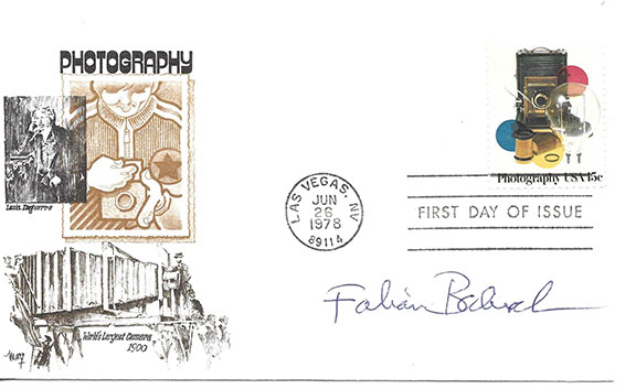 BACHRACH, Fabian (1917-2010) Celebrity photographer. Known for his portrait of John F. Kennedy, later used as his official portrait after becoming president. First Day Cover celebrating Photography. Fine 3 part cachet. U.S. 15 cent Photography postage stamp cancelled First Day of Issue, Las Vegas, NV Jun 26, 1978. Bachrach has hand signed this cover with a fine ink signature. V/F condition...........................$45.00![]() |