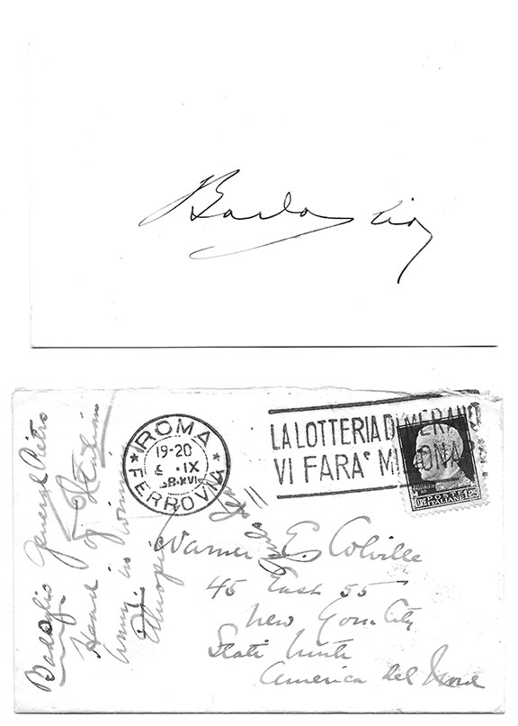 BADOGLIO. (Pietro). (1871-1956). Italian soldier, officer in WW1, promoted to General (1919), succeeded Diaz as Chief of General Staff (1919-1921), signed armistice for Italy. Ambassador to Brazil (1924), Chief of General Staff (1925-28), Marshall (1926), Governor General of Libya (1928-33), commanded Italian forces in the Ethiopian campaign, (19935-36), succeeded Mussolini as Premier (1943-44) after Benito Mussolini was overthrown in July 1943. Badoglio surrendered Italy to the Allies in September 1943 during WW2. He served as Premier only until after the capture of Rome in June 1944. A scarce signature, in ink, well centered on a heavy 3”x4.25” card. Original envelope with a 1.25 Lire stamp with a portrait of Vittario Emanuele III cancelled in Rome. Not a common signature...........$175.00