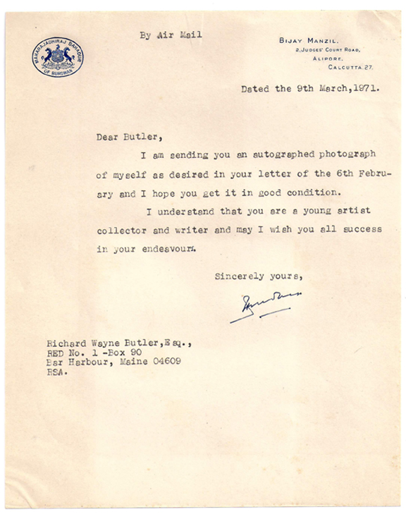 HIS HIGHNESS MAHARAJADHIRAJA BAHADUR (Sir Uday Chand Mahtab) (1905-1984). Installed as Maharajadhiraja Bahadur of Burdwan in 1943. Chairman of India Red Cross Appeal (1943-46). Typed letter signed on his official embossed letterhead. Calcutta, 9 March 1971. He writes to an American collector sending an autographed photograph (not included) and wishes the collector success as a young artist and writer. In fine condition .............................................$75.00