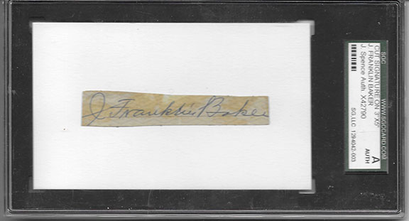BAKER, J. Franklin (1886-1963). American professional baseball player. Played in Major League Baseball from 1908-1922. Played with the Philadelphia Athletics and the New York Yankees. Know as Home Run Baker, he was the symbol of power at the diamond. Ink signature “J. Franklin Baker” cut from a check. Just a small portion of the bottom of the “J” cut off. Housed in an SGC holder, authenticated by J. Spence ..................................$425.00