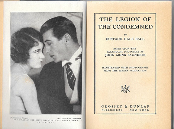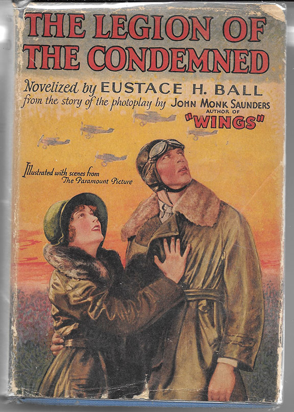 BALL, Eustace H. The Legion & the Condemned, Grosset & Dunlap, N.Y, 1928. Two hundred fifty-six pages. Illustrated with photographs from the Screen Production. Frontispiece of Fay Wray ad Gary Cooper. Long inscription on the front free endpaper by Fay Wray: “Dear George Bannister (noted collector of aviation related items) The Legion of the Condemned was my first film with Gary Cooper-and also the time of my meeting John Monk Saunders. With best regards, Fay Wray,” A very good bright copy with a good and very scarce dust jacket in a protective cover...........$160.00