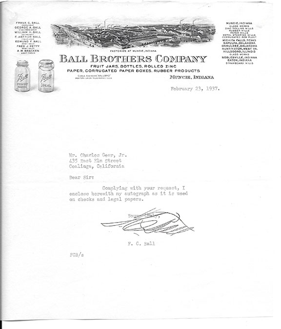 Typed letter on the fancy letterhead of the Ball Brothers Company. Muncie, In. Feb. 23, 1937. Signed by Frank C. Ball as president of the company. Together with a card signed by George A. Ball, who was Vice-President. Two very uncommon signatures............................SOLD