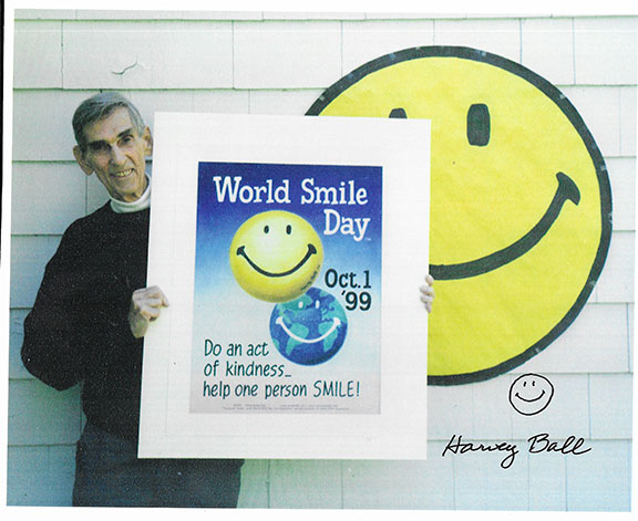 BALL, Harvey (1921-2001). American commercial artist. Creator and designer of “Smiley” in 1963. It became an enduring and notable international icon. Ball worked for the State Mutual Life Assurance Corp. where the employees had a low morale. He created Smiley and 100 pins were made for the employees. It became quite a hit and by 1971, 50 million Smiley buttons were sold. The phrase “Have a Happy Day” became associated with Smiley. World Smile Corporation was founded by Ball in 1999. Color photograph, 8”x10”, of Harvey Ball holding a poster for the first World Smile Day. Harvey Ball has signed the photograph and has hand drawn an original “Smiley” face. In excellent condition................$115.00