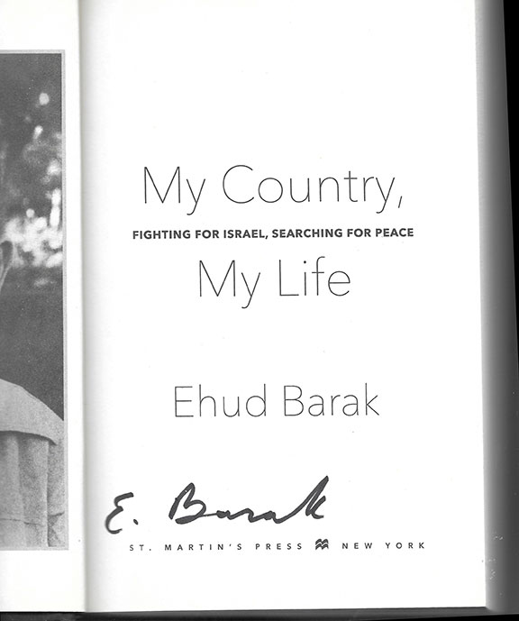 BARAK, Ehud. (1942- ) Tenth Prime Minister of Israel (1999-2001). Military leader began in the IDF in 1959, spanning 35 years. His book My Country, Fighting for Israel, Searching for Peace My Life. St. Martin’s Press, N.Y. 2018, First Edition so stated. Four hundred seventy-two pages illustrated many in color. Very boldly signed on the title page “E. Barak.” In fine condition with an excellent dust jacket. Not a common title to be found signed..........$125.00 |