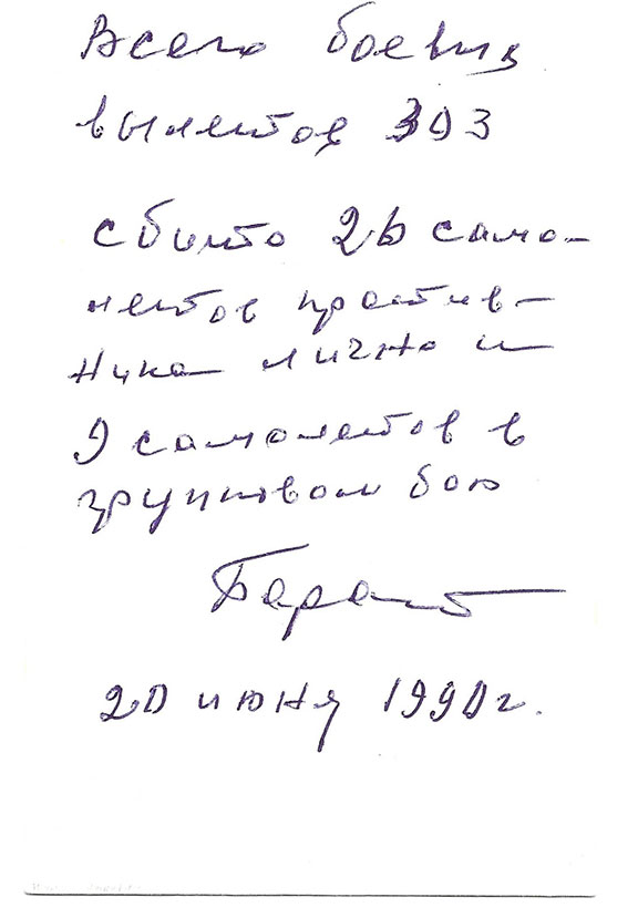 BARANOV, Mickail Russian Ace, WWII, credited with 26 victories. Hero of the USSR. Autograph letter signed on a 3”x5” card on both sides, signed and dated on both sides “20.06.90.” Fine condition............................$95.00 |