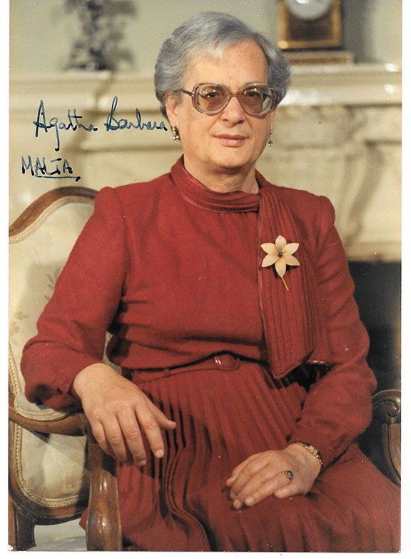 BARBARA, Agatha (1923-2002). Third President of Malta. First woman to hold the Office of President (1982-1987). She managed to prevent a civil war. In 1958, relations between the British and Maltese deteriorated. She participated in protests and was sentenced to 43 days with hard labor. Color photograph, 5”x7’, half length pose sitting in a chair. Boldly signed “Agatha Barbara” adding “Malta” in her hand. Not a common signature.............................................$40.00