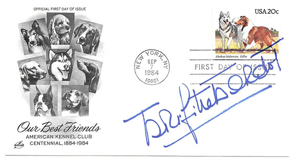 BARDOT, Brigitte (1934-December 28, 2025). Iconic French actress, dancer, singer, model, and animal rights activist. Famous for her beauty and one of the best-known symbols of the sexual revolution, international movie star she aced in 47 films, her nickname was “sex kitten.” For her 40th birthday she appeared nude for Playboy Magazine. Wonderful, First Day Cover honoring “Our Best Friends” American Kennel Club Centennial. Affixed is a USA 20 cent dog stamp cancelled New York, Sept 7, 1984. Very boldly signed with a magnificent signature of Brigitte Bardot. In V/F condition..........................$95.00