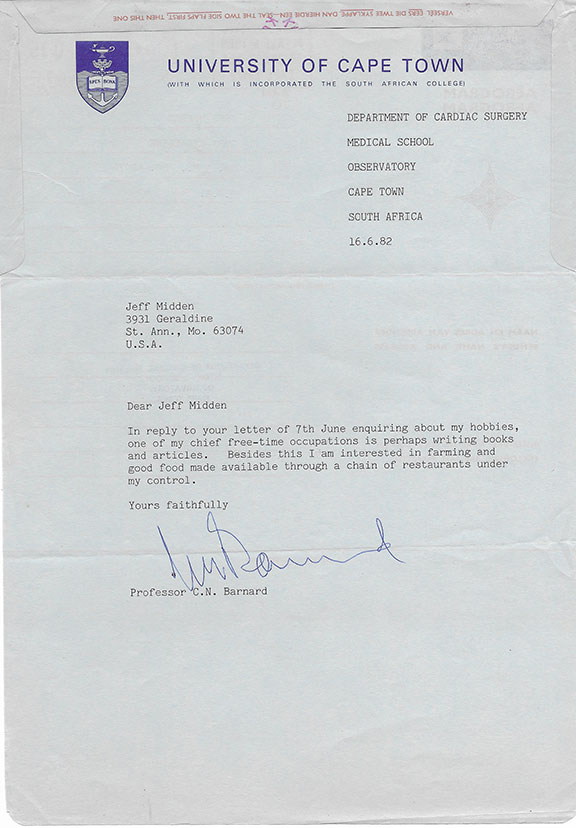 BARNARD, Christian (1922-2001). South African cardiac surgeon who performed the world’s first human to human heart transplant. He was sought by celebrities from around the world. He often courted controversy by employing black nurses. Fine typed letter signed, one page, 16/6/82 on University of Cape Town aerogram stationary/envelope. He writes: “In reply to your letter of the 7th June enquiring about my hobbies, one of my chief free-time occupations is perhaps writing books and articles. Besides this I am interested in farming and good food made available through a chain of restaurants under my control. Fine large ink signature........$195.00
