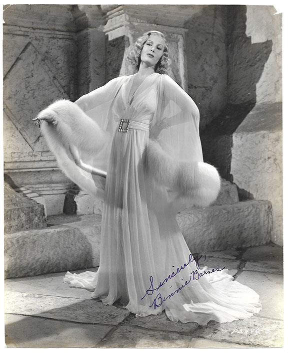 BARNES, Binnie (1903-1998). British actress and leading lady. Photograph, B&W, measures appx. 7.5”x9” beautiful full length pose in a white chiffon negligee, trimmed with white fox highlighted by a square buckle of topaz stones at the waistline designed by Edith Head. Signed : “Sincerely Binnie Barnes.” In V/G condition ..................$47.50![]() |
