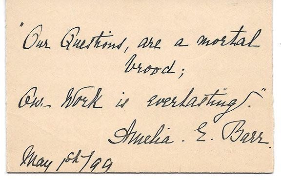BARR, Amelia E. (1831-1919). British novelist who moved to America. She established a school for girls. She was married and had 12 children. She published semi-historical tales and novels. Autograph quotation signed on a heavy 3”x5” card: “Our questions, are a mortal brood; Our work is everlasting.” Signed “Amelia E. Barr May 1st/99.”.................$95.00![]() |