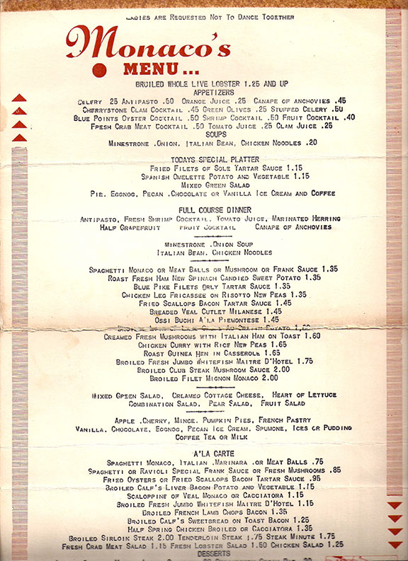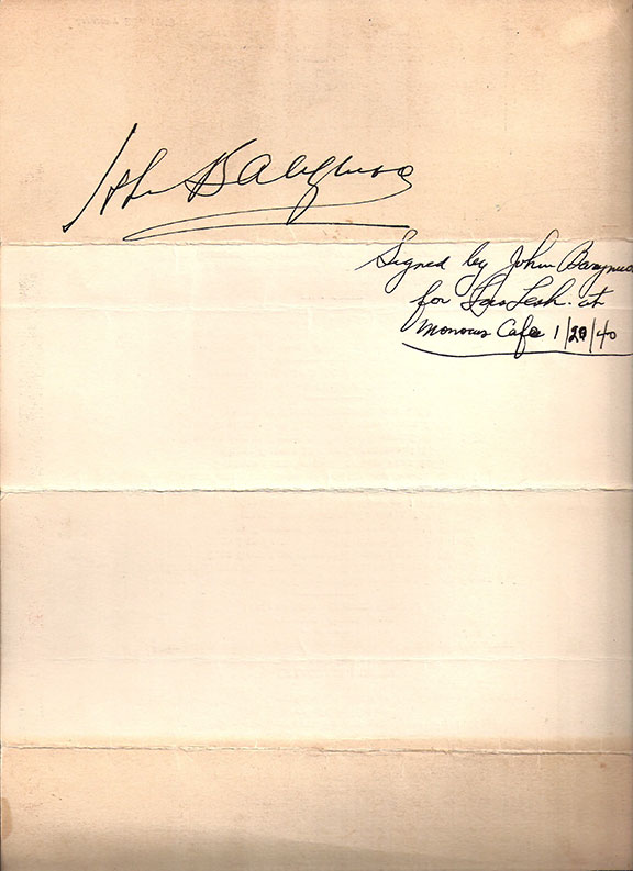 BARRYMORE, John (1882-1942). Great actor, won an Academy Award for The Great Profile. Full Menu for “Monaco’s” Restaurant, January 20, 1940 where whole lobsters were $1.25. Ladies are requested “Not To Dance Together”. Signed on the back of the menu by John Barrymore. The nicest and largest signature of John Barrymore we have seen...............SOLD