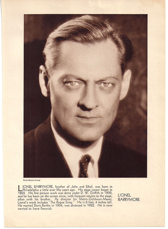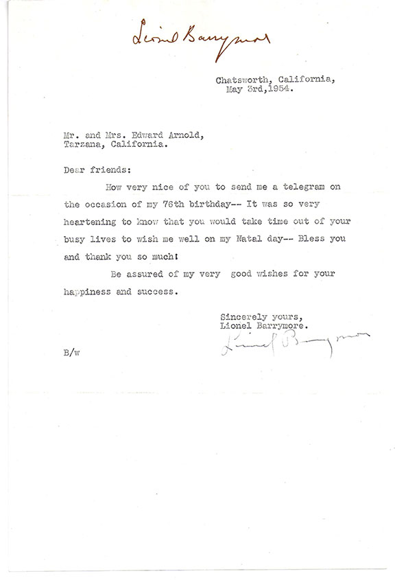 BARRYMORE, Lionel (1878-1954). American actor who made over 250 films. Won an Academy Award for A Free Soul. Played Dr. Gillespie in all 15 Dr. Kildare movies. Appeared in Key Largo and It’s a Wonderful Life. T.L.S., one page, on his name imprinted stationery, Chatsworth, CA. May 3, 1954. (Died 11/15/54). In part: “How very nice of you to send me a telegram on the occasion of my 76th birthday--it was so very heartening to know that you would take time out of your busy lives to wish me well on my Natal day--..” Signed in full, together with the original envelope and a fine portrait of Barrymore for framing............... $275.00