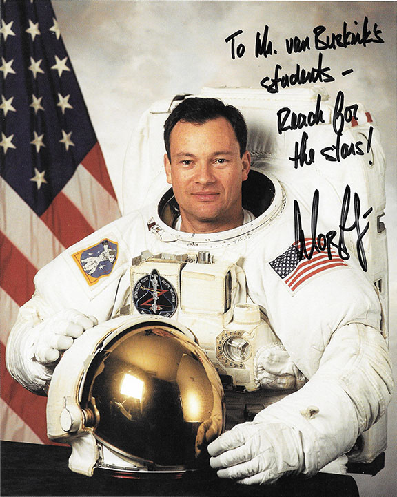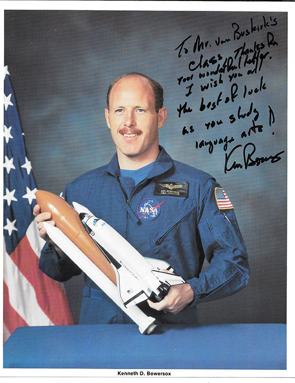 BOWERSOX, Ken. Flew on the Space Shuttle Columbia. He threw the first pitch during the 1995 World series. Braves/Indians at Jacobs Field. Color photograph in his flight suit bearing a lengthy presentation inscription signed.