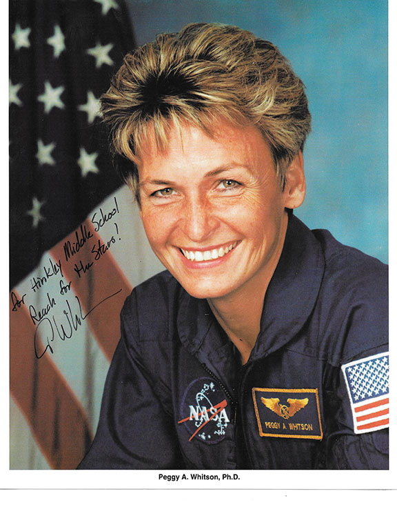 WHITSON, Peggy. She threw the ceremonial first pitch on the International Space station for the 2002 World Series. Color photograph, inscribed and signed.