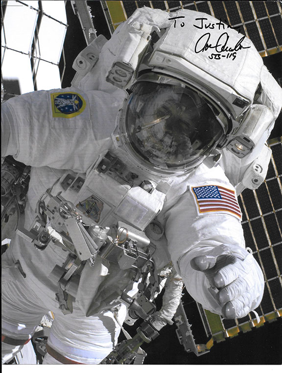 LOPEZ-ALEGRIA, Michael. Crew-member on the STS-73. On August 16, 1996 he threw the terrestrial first pitch for the Cleveland/Indians game. Color photo in his space suit inscribed and signed.
