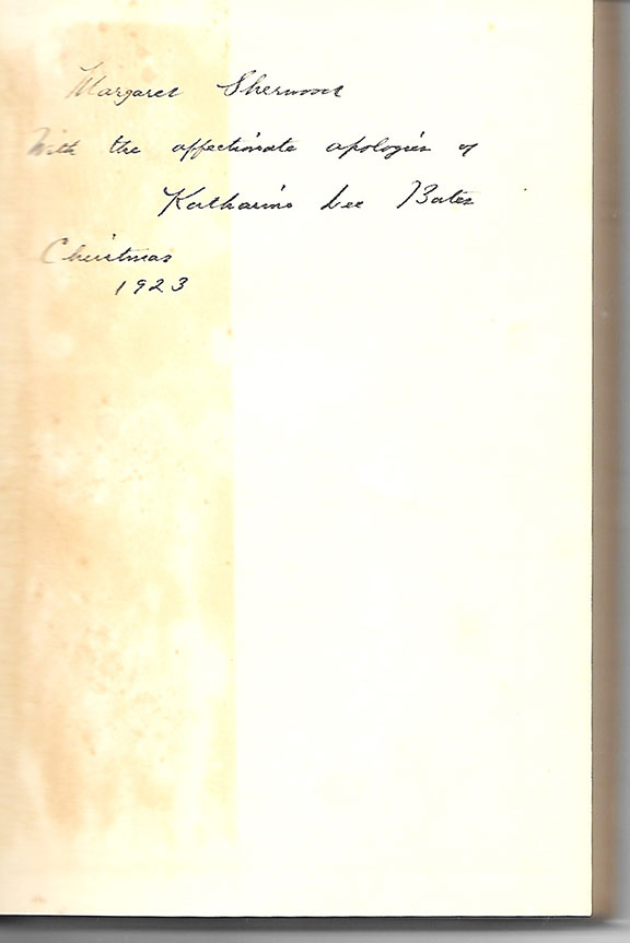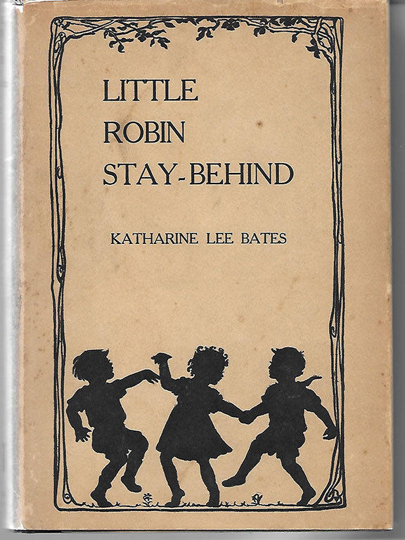 BATES, Katherine Lee (1859-1929). American songwriter and author. She is best remembered for her trip to the top of Pike’s Peak in Colorado Springs where she got the vision to write the words to the anthem “America the Beautiful.” She popularized Mrs. Santa Claus through her poem “Goody Santa Claus on a Sleigh Ride.” She was a lesbian who lived with her partner for 25 years. When her partner died Bates wrote “Yellow Clover: A Book of Remembrance” that celebrated their love. Her book: “Little Robin Stay-Behind.” The Womans Press,New York 1923. First Edition, two hundred twenty-nine pages. On the front free endpaper, Bates has written: “Margaret Sherwood with the affectionate apologies of Katherine Lee Bates Christmas 1923.” Book in very good to near fine condition with a very nice and scarce dust jacket. Light tan discoloration from the flap of the dustjacket on the front free endpaper............................$285.00