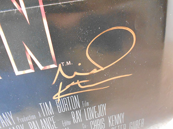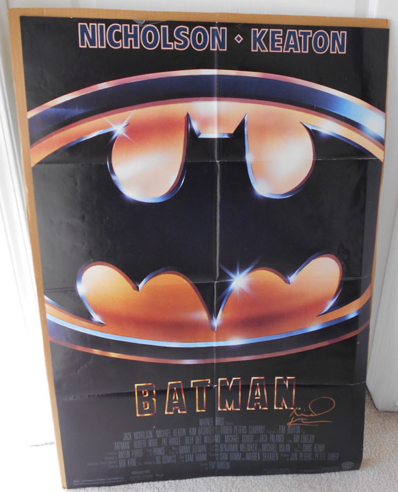 BATMAN.  Original single sided Batman movie poster.  Warner Bros. 1989. Starring Michael Keaton as Batman. Jack Nicholson as the Joker and Kim Bassinger. Release date of the movie was  June 1989.  The film was a financial success grossing over four hundred million dollars. It was the 5th highest grossing film in history. It also won an Academy Award. Poster measures a large 28”x40” and has the original folds. Very boldly signed by Michael Keaton using a gold tip marker. Would look fabulous framed ................................