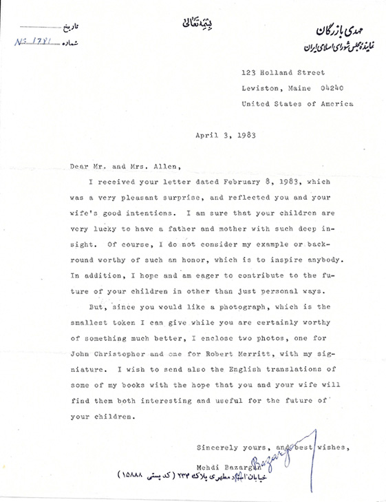 BAZARGAN, Mehdi (1908-1995). Iranian activist, First Prime Minister of the Islamic Republic 11 Feb. 1979-6 Nov. 1979. Appointed Prime Minister by Ayatollah Khomeini. In April 1979 he escaped an assassination attempt. He resigned following the U.S. Embassy takeover and hostage taking. Fine content typed letter signed, one full page, April 3, 1983. He writes in part: “...I am sure that your children are very lucky to have a father and mother with such deep insight. Of course, I do not consider my example or backround worthy of such an honor, which is to inspire anybody. In addition, I hope and am eager to contribute to the future of your children in other than just personal ways. But, since you would like a photograph, which is the smallest token I can give while you are certainly worthy of something much better....I wish to send also the English translations of some of my books with the hope that you and your wife will find them both interesting and useful…” Signed: “M. Bazargan”. Excellent and attractive........................ $195.00