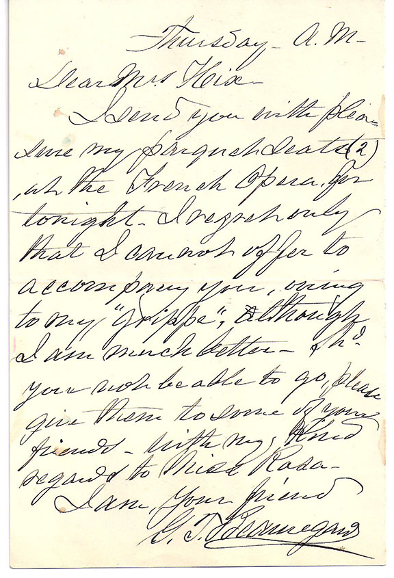 BEAUREGARD, P.T.G. (1818-1893). Confederate Major General who initiated the attack on Ft. Sumter which started the Civil War. Beauregard also led with great distinction at the First Bull Run, Shiloh and in the defense of Richmond. Autograph letter signed, one very full page, no date, to Dear Mrs. Hise. Beauregard writes: “Tuesday, A.M. I send you with pleasure my (?) seats (2) at the French Opera for tonight. I regret only that I cannot offer to accompany you, owing to my ‘grippe’, although I am much better. Should you not be able to go, please give them to some of your friends-with my kind regards to Miss Rasa. I am your friend, G.T. Beauregard”. In excellent condition.....................SOLD