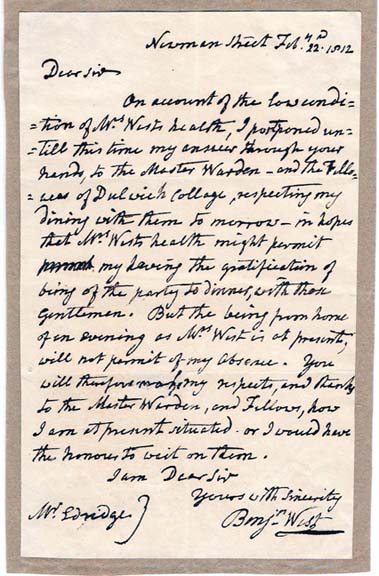 22, 1812, Newman Street [London]. Reads in part: "On