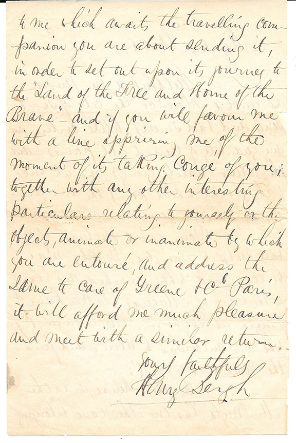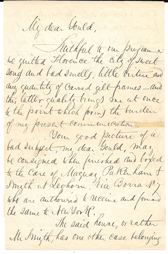 BERG, Henry (1811-1888). Founder of the ASPCA (American Society for the Prevention of Cruelty to Animals) (1866) and served as its first president. He was instrumental in founding the Society for the Prevention of Cruelty to Children (1875). Scarce autograph letter, two very full pages, signed in full, no date, to a Mr. Gould. In part: “Faithful to our program….Florence the city of sweet songs and bad smells, little virtue and any quantity of carved gilt frames and the latter quality brings me at once to the point…..Your good picture of a bad subject….may be consigned when finished and boxed to the care of…..at Leghorn via Borra #7 who are authorized to receive and forward the same to New York. The said house, or rather Mr. Smythe, has one other case belonging to me which awaits the traveling companion you are about sending it, in order to set out upon its journey to the “Land of the Free and Home of the Brave”. Signed in full. In V/G condition. Handwritten letters of Berg are quite scarce...........$375.00