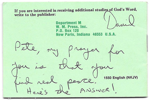 BERKOWITZ, David (1953- ) Murderer, confessed to killing six people and wounding more in the New York City area during the 1970’s. Known as the “Son of Sam” and the “44 Caliber Killer.” Berkowitz was sentenced to six life sentences, a maximum of 365 years in prison. Printed pamphlet: “How to Know God.” Thomas Nelson Inc., Publishers, 1982, 50 pages. On the rear cover Berkowitz has penned: “Pete, my prayer for you is that you find real peace. Here’s the answer! David.” In fine condition..................$185.00
