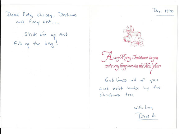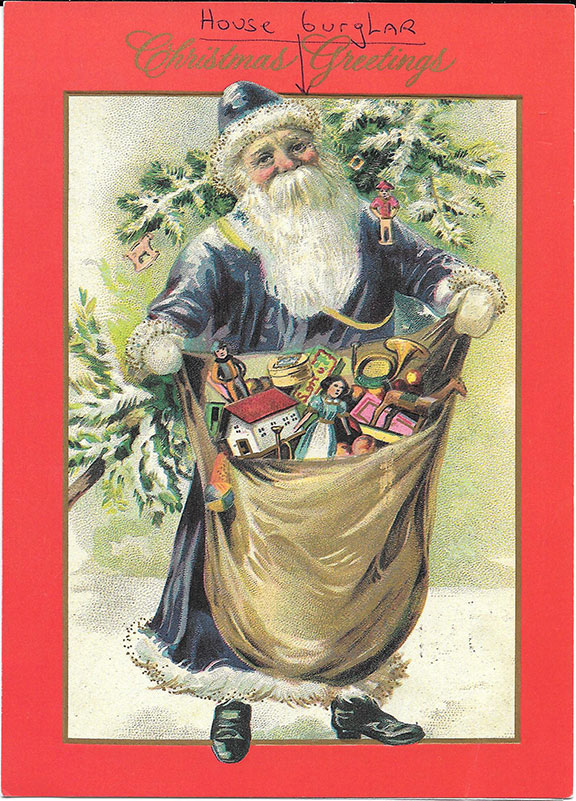 BERKOWITZ, David (1953- ) Murderer, confessed to killing six people and wounding more in the New York City area during the 1970’s. Known as the “Son of Sam” and the “44 Caliber Killer.” Berkowitz was sentenced to six life sentences, a maximum of 365 years in prison. Very scarce Christmas card with an illustration of Santa on the cover. Above Santa, Berkowitz has written: “House burglar” and has drawn an arrow down to Santa’s head. On the inside panel Berkowitz has written: “Dear Pete, Chrissy, Darlene and Pissy cat... Stick e’m up and fill the bag!” On the second panel Berkowitz has written: “Dec. 1990, God bless all of you and don’t smoke by the Christmas tree, With Love, Dave B.” In very good condition and most unusual..................SOLD